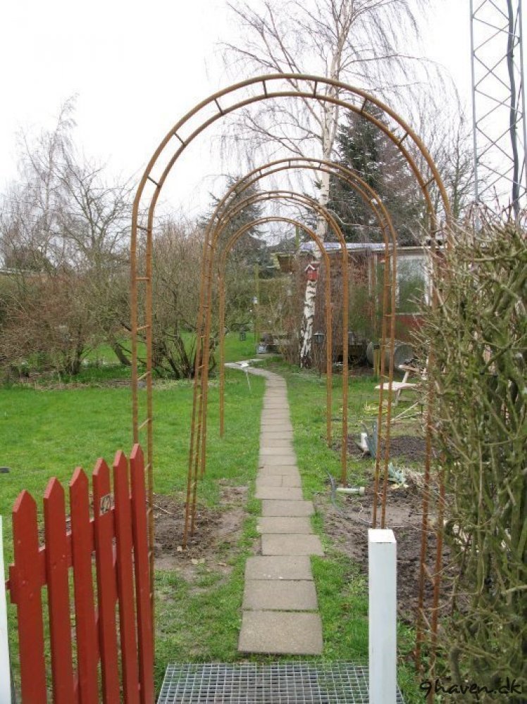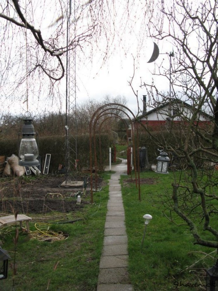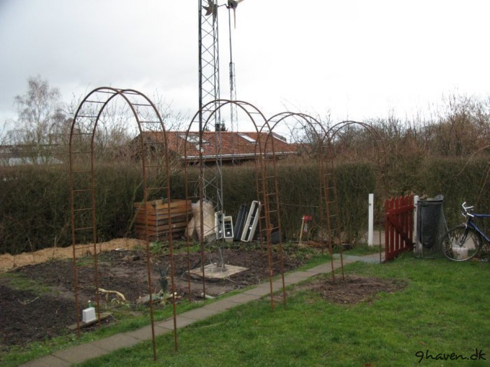 Her i foråret er et af projekterne i haven, at få lavet en “tunnel” af roser, som man går igenem i starten af haven.Jeg har sat rosenbuerne midlertidigt op: