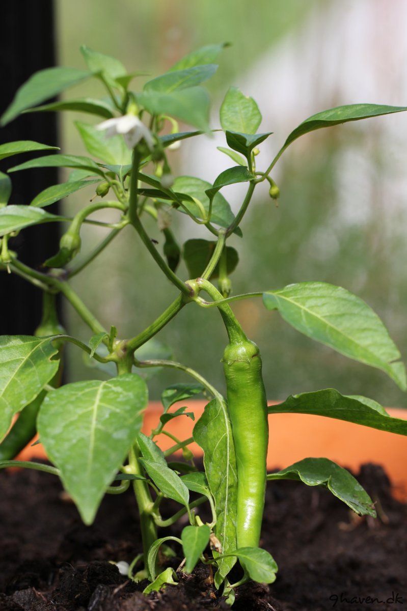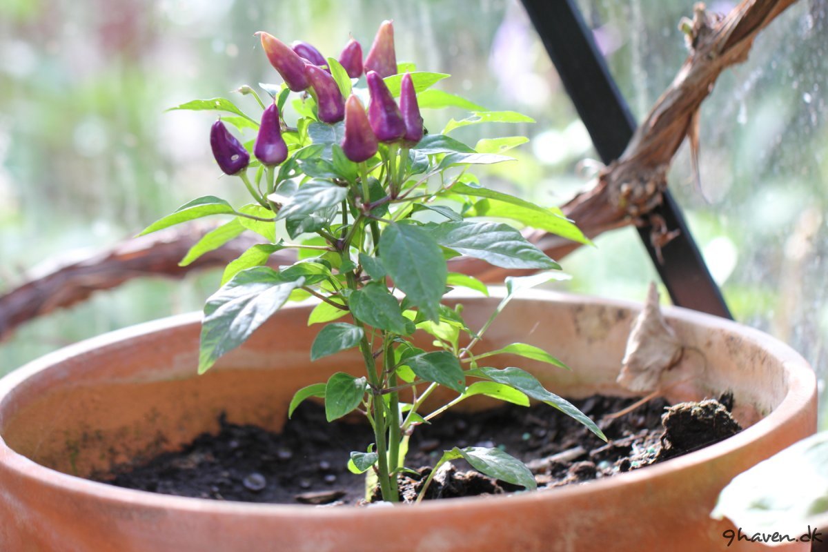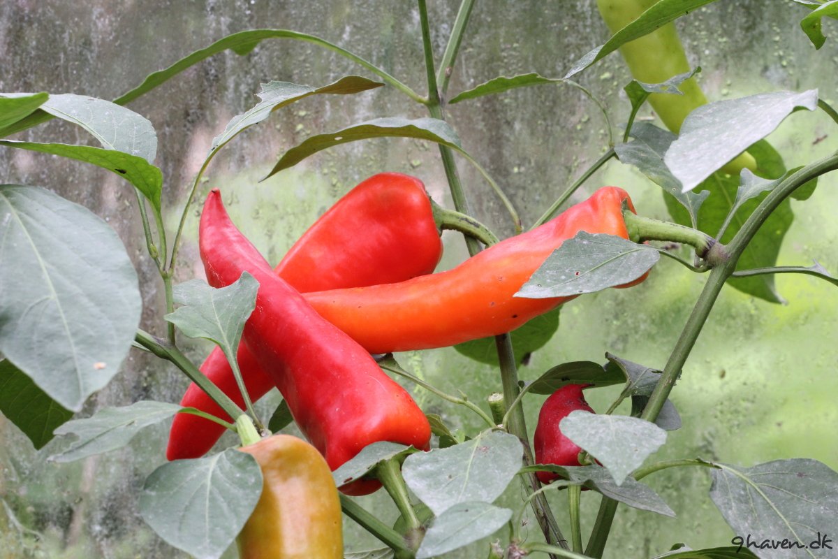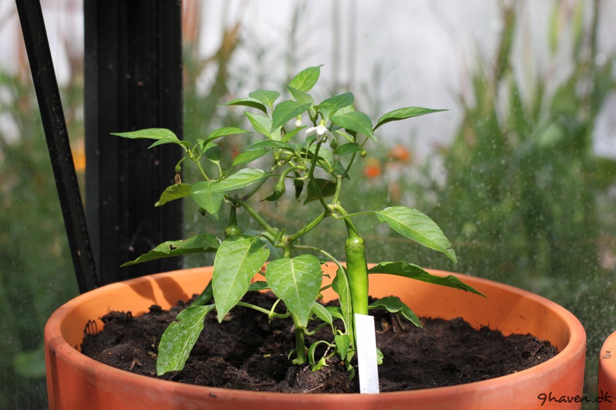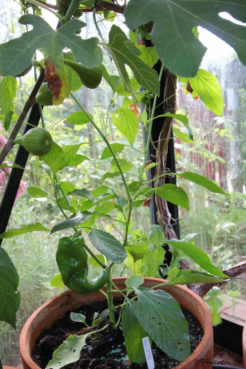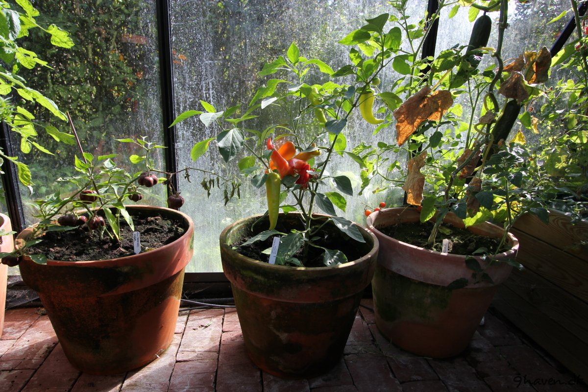 I drivhuset er der bla. 11 chili planter, 6 tomater, 1 agurk og 1 aubergine