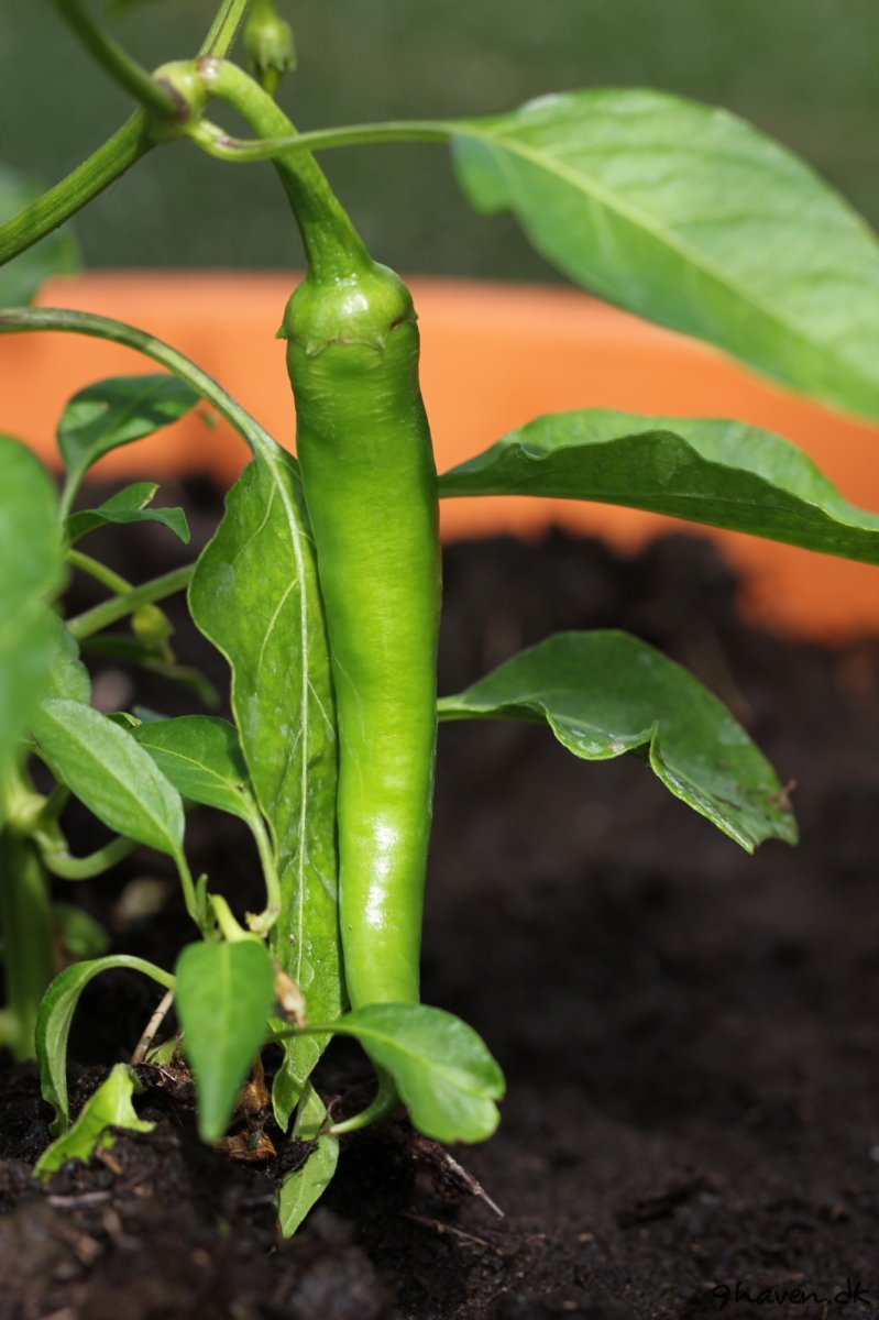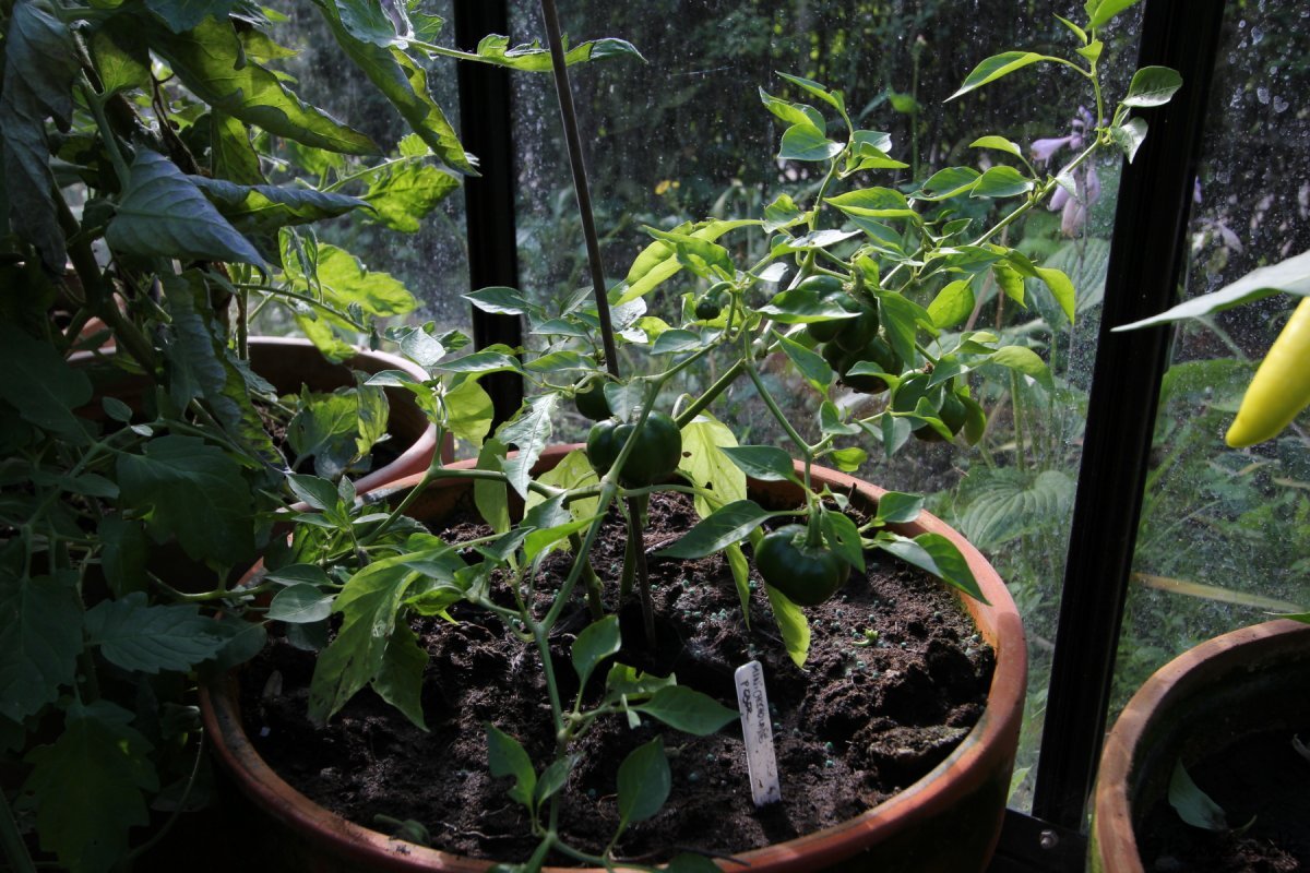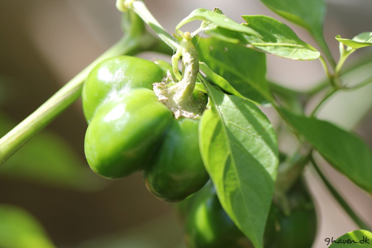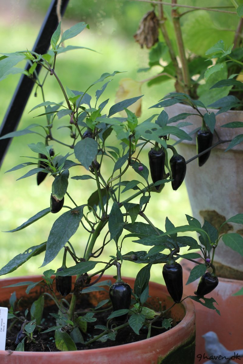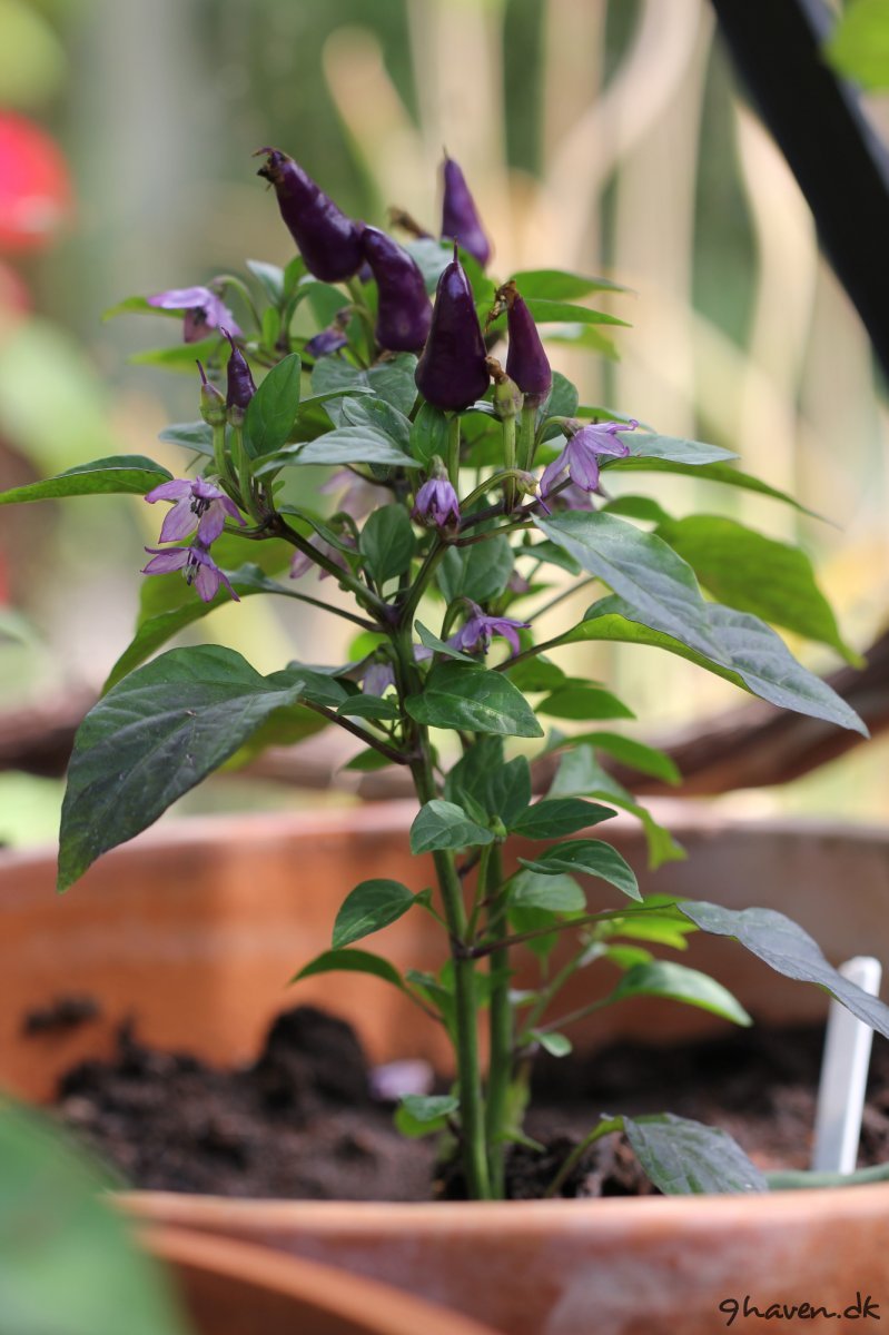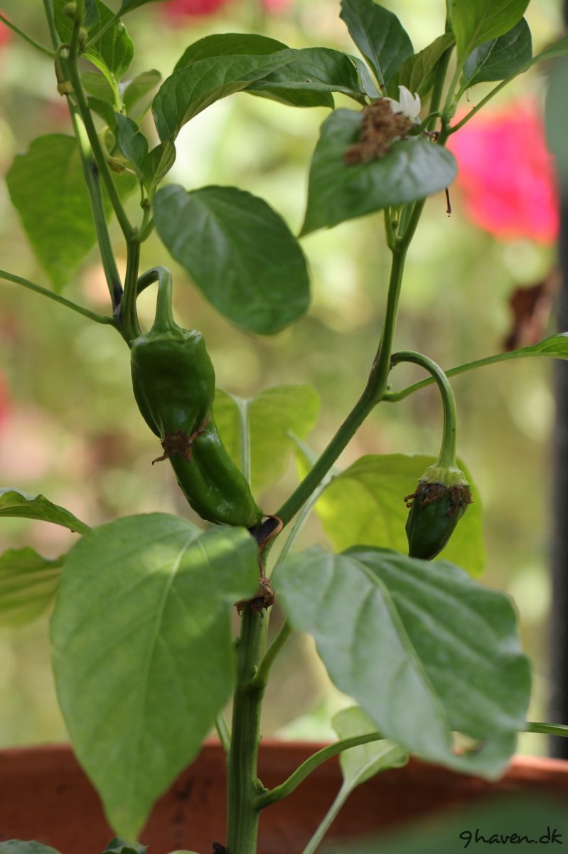 I drivhuset er der bla. 11 chili planter, 6 tomater, 1 agurk og 1 aubergine