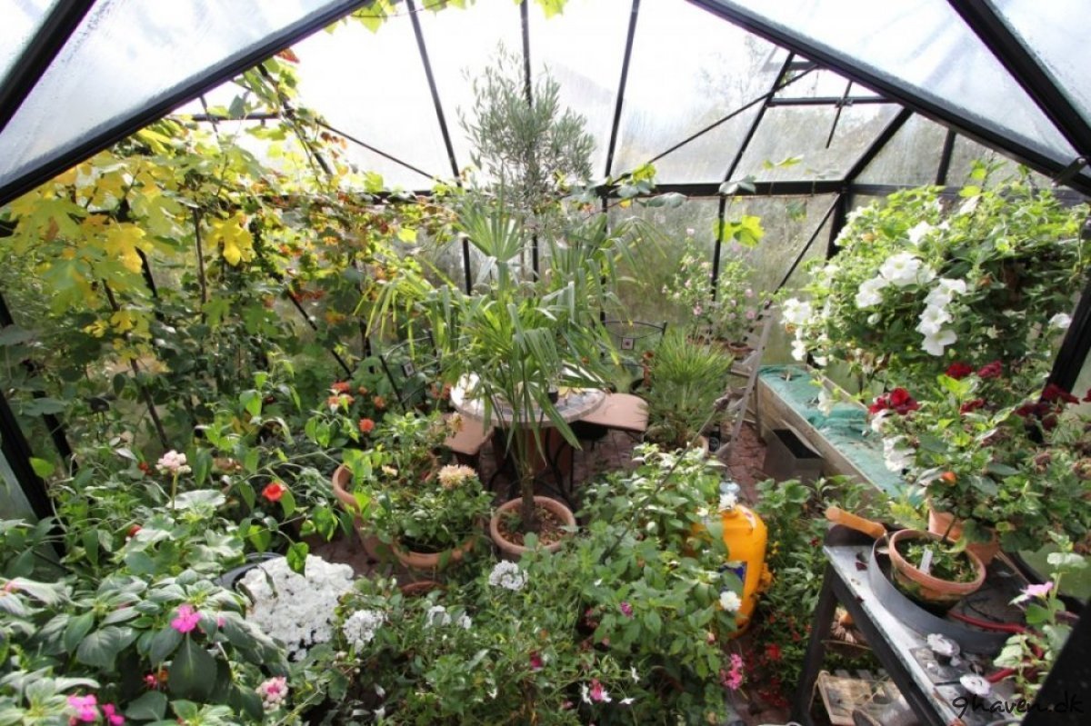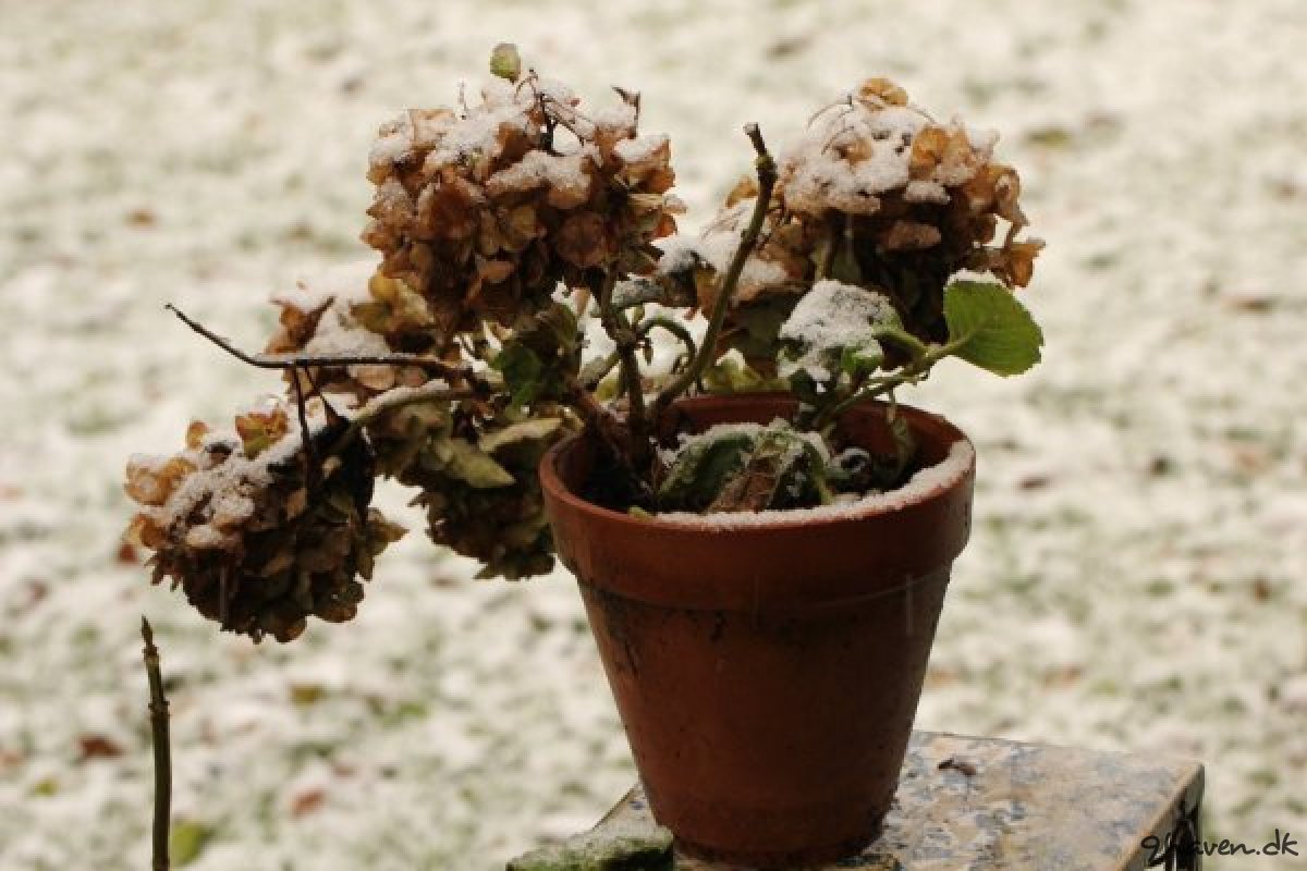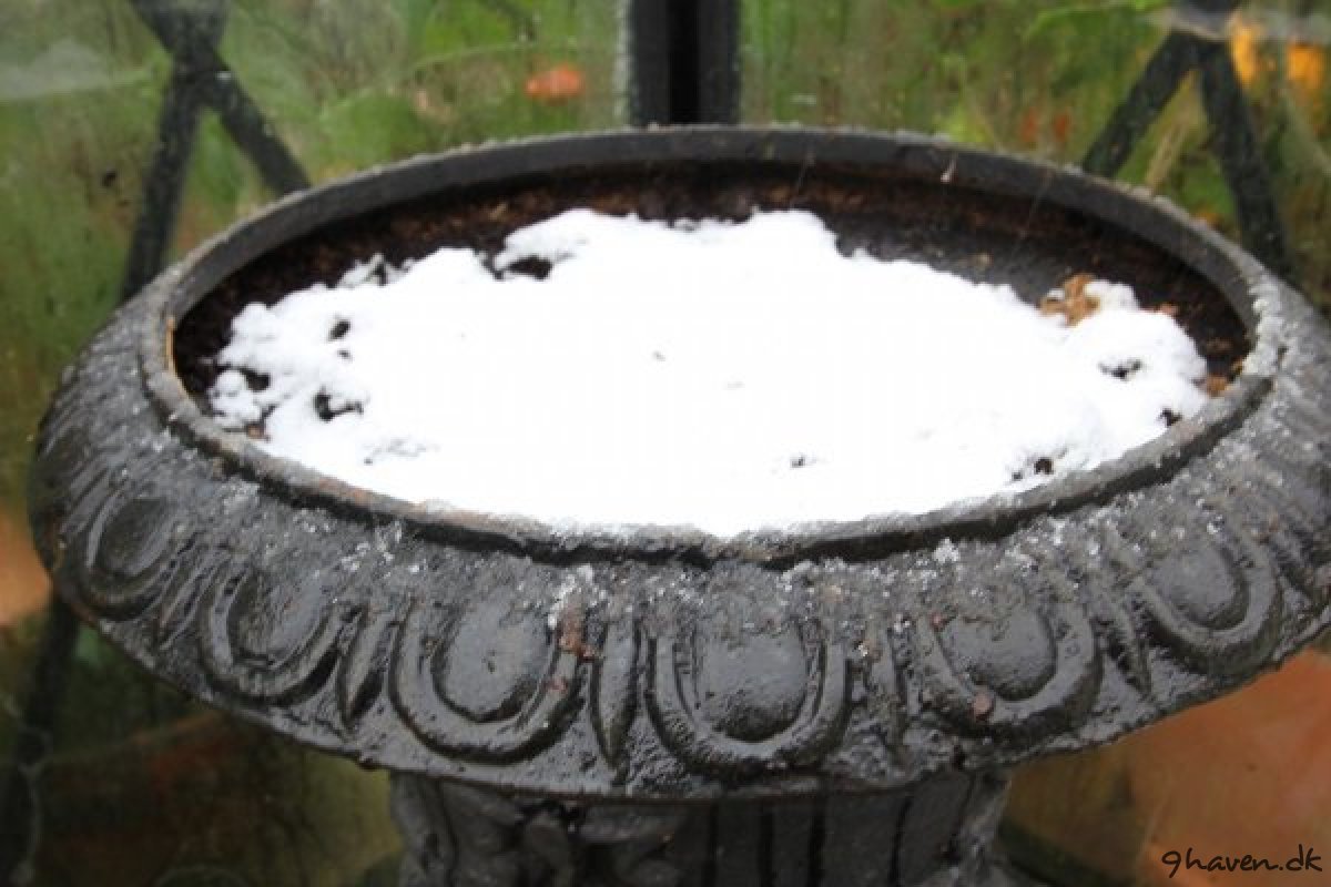 Pelargonier, Georginer i krukker, et par palmer, Oliventræ, Chiliplanter plus diverse står i drivhuset hvor jeg har sat en termostatstyret gasvarmer op, så der minimum er 5 grader.