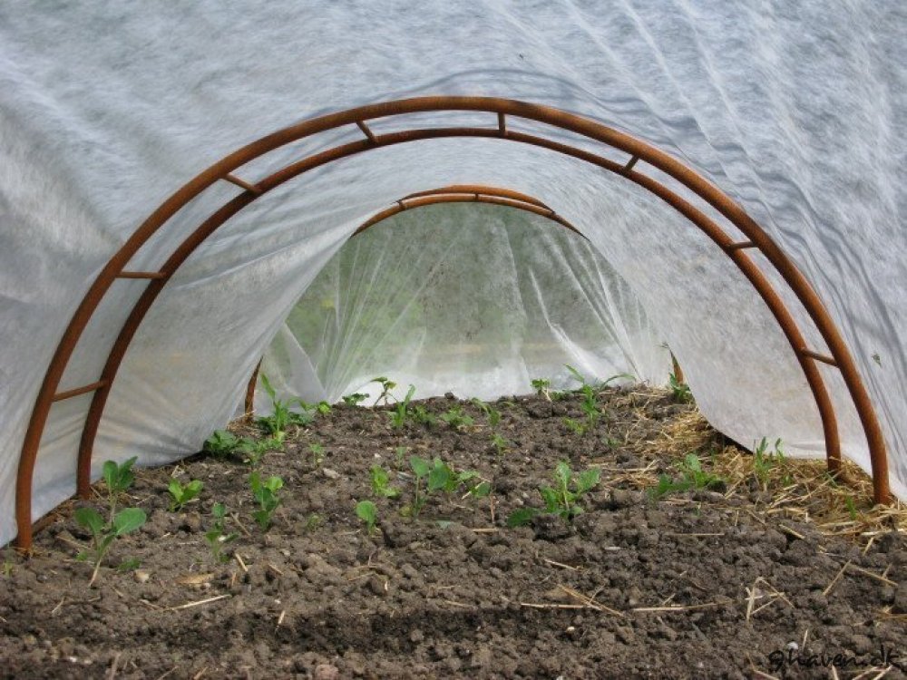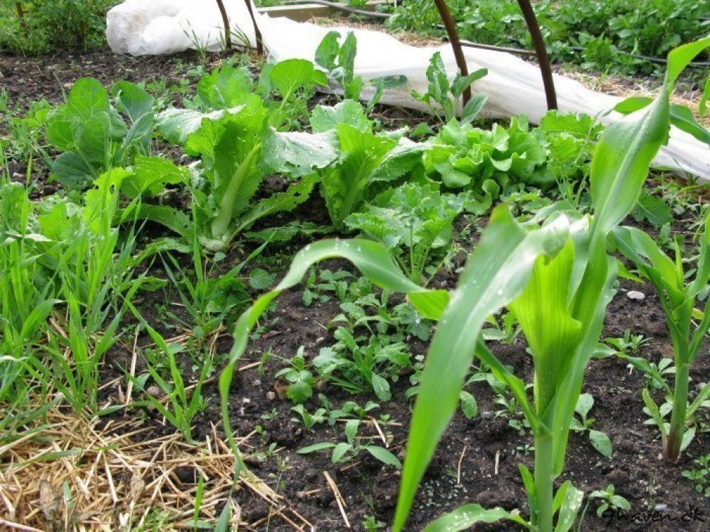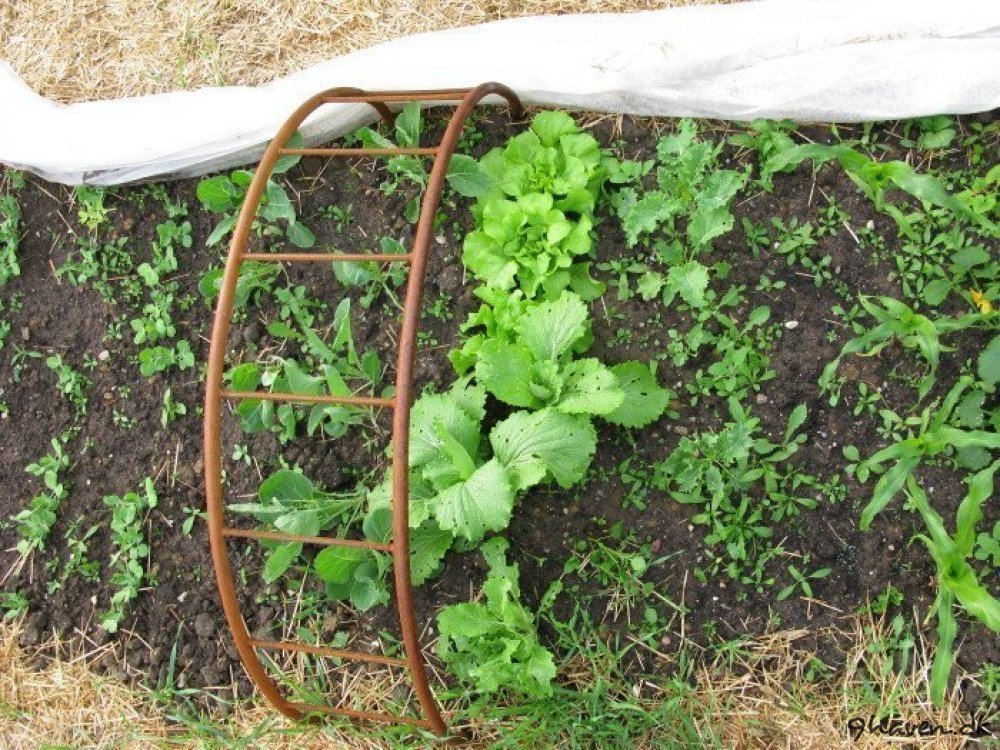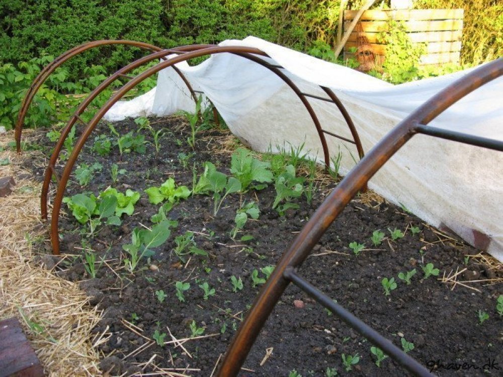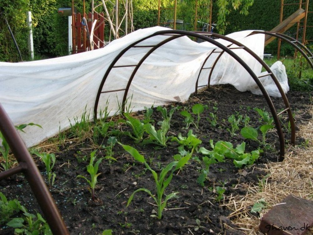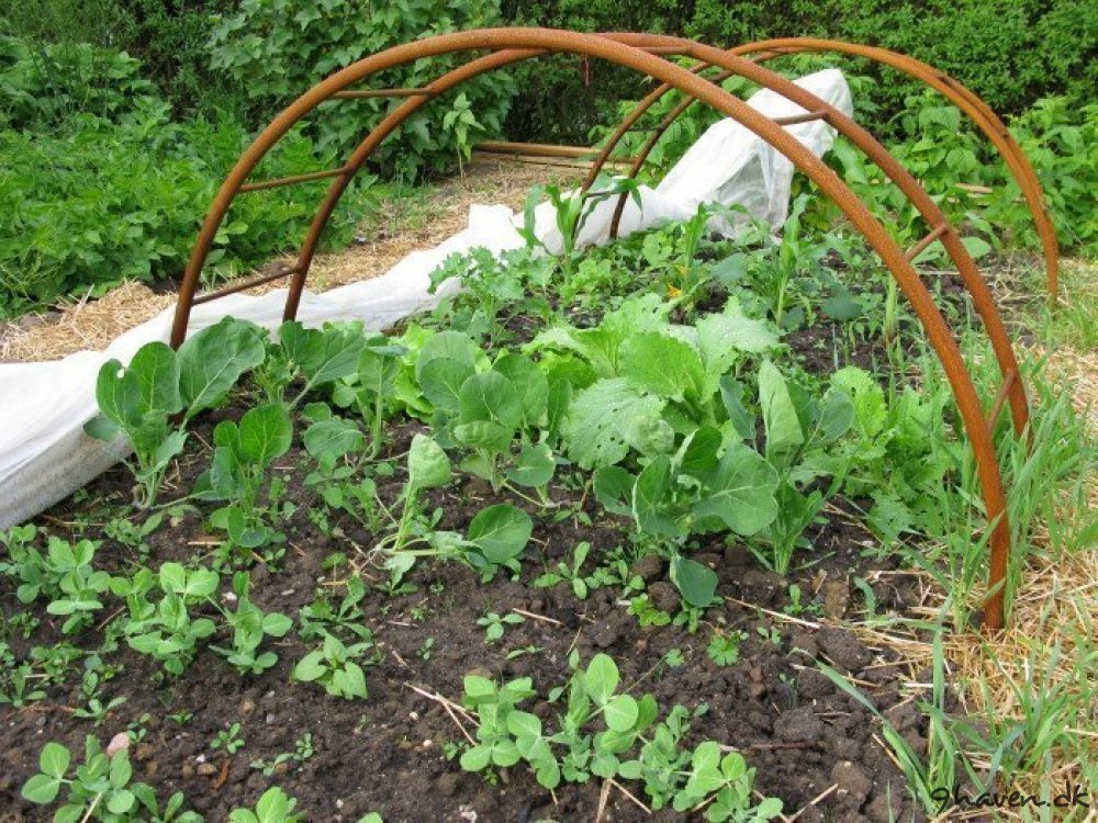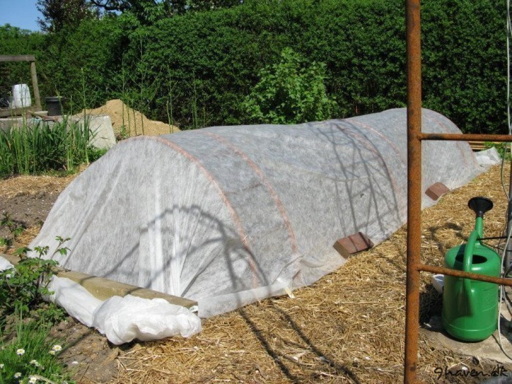 De forkultiverede planter i køkkenhaven, der står under fiberdug stortrives.