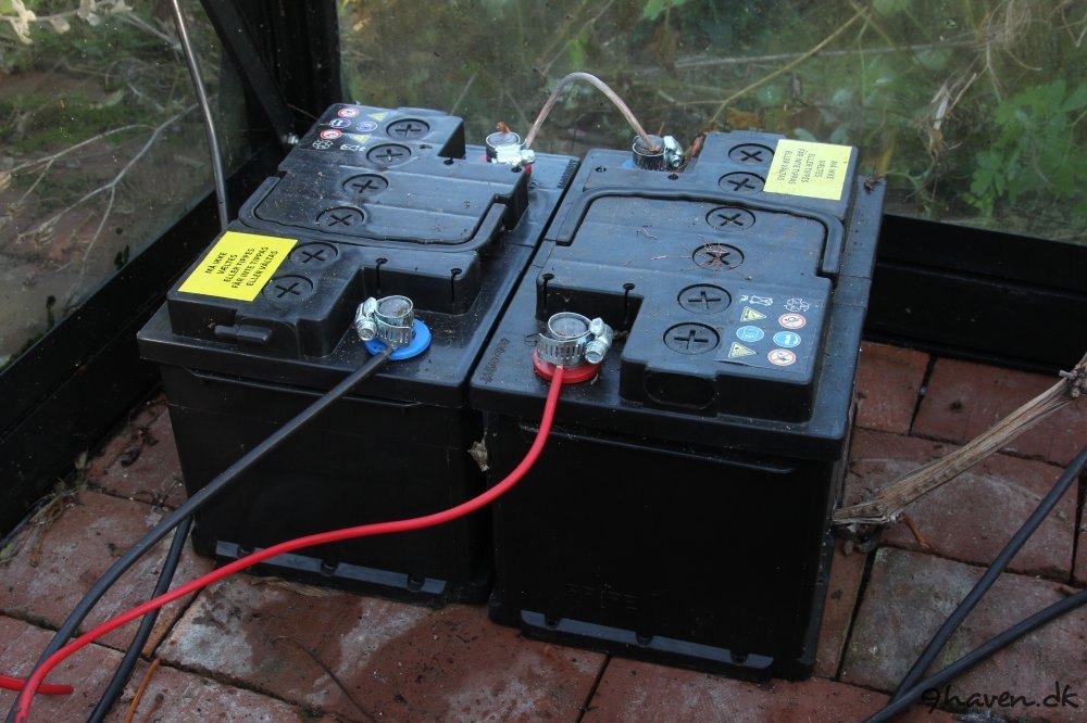 Solcelle julebelysningen består af to solceller og to batterier, som er forbundet til en laderegulator, som er “hjernen” i solcelleanlægget.