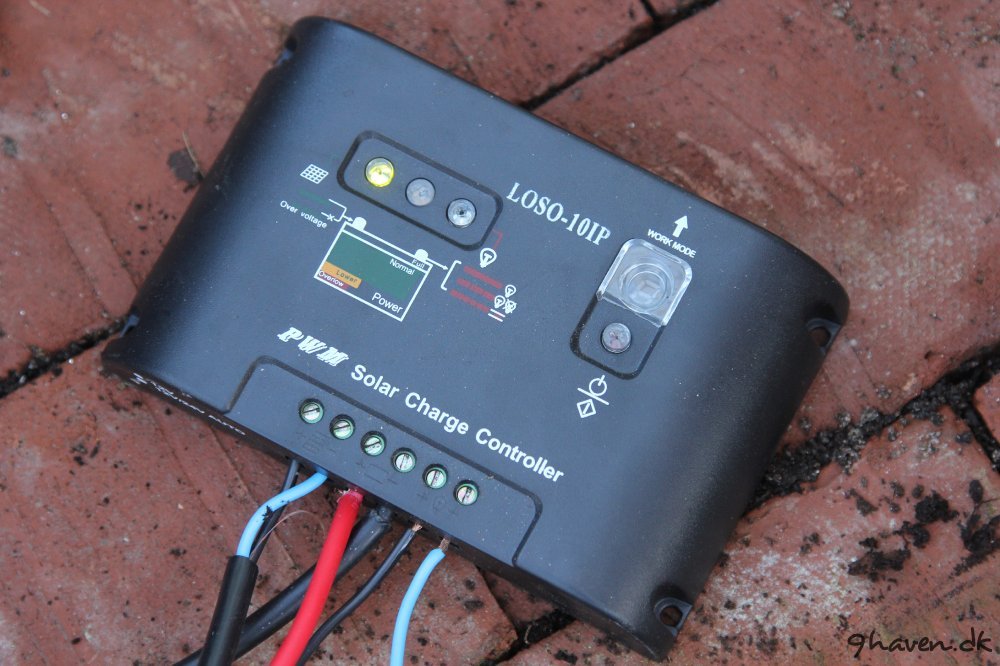 Julebelysningen er også tilsluttet laderegulatoren, som er så smart at den selv tænder for lyset når det bliver mørkt.